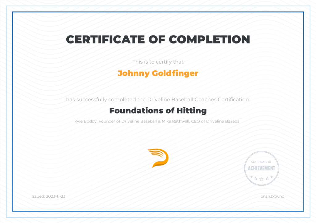 The Driveline Baseball certificate in Foundations of Hitting is intended for instructors who work with more advanced players. It is assumed that the players already have good basic mechanics. The coursework for the certification emphasizes in-game production. hitting the ball hard, launching the ball at an effective angle, and a successful approach at the plate. It nicely complements Epstein’s focus on mechanics and is the logical next step in the development of a hitter.