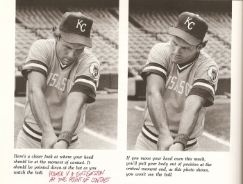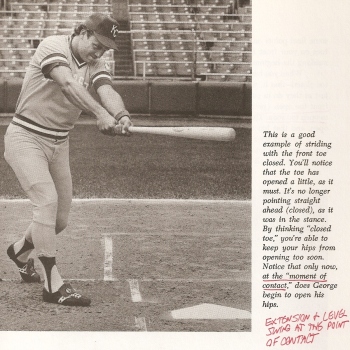 George Brett is in the MLB Hall of Fame with 3154 hits and a .305 batting average. Nonetheless, he does not seem to understand the position of the batter and bat at the point of contact. In Charley Lau’s The Art of Hitting .300, Brett demonstrates what he thinks is the ideal position at point of contact with the arms fully extended in a Power V and shoulders square or perpendicular to the bat (see the photos immediately below). However, that is not how batters actually hit the ball. At contact the hitter typically has his shoulders more square to the pitcher, the bat is in front of the body, and the arms are still unraveling to move to extension. See the color photo of Brett at the point of contact. What Brett feels he is doing and what he is really doing are two different things.